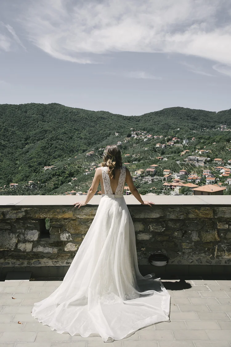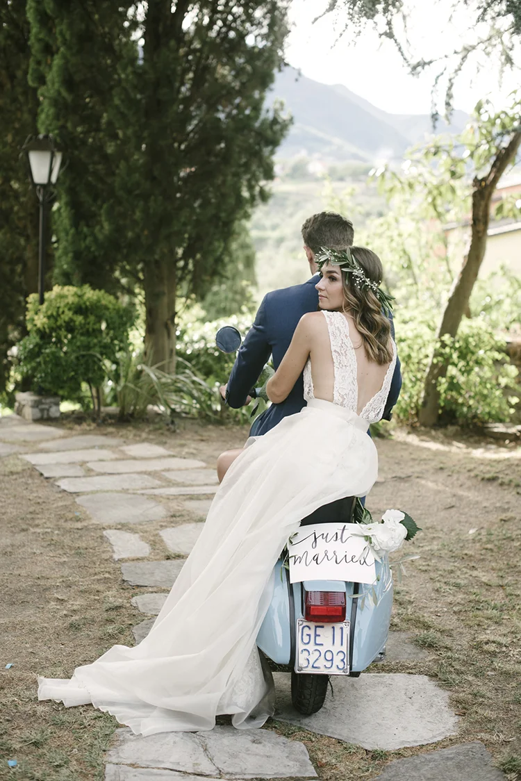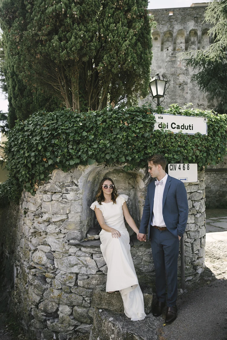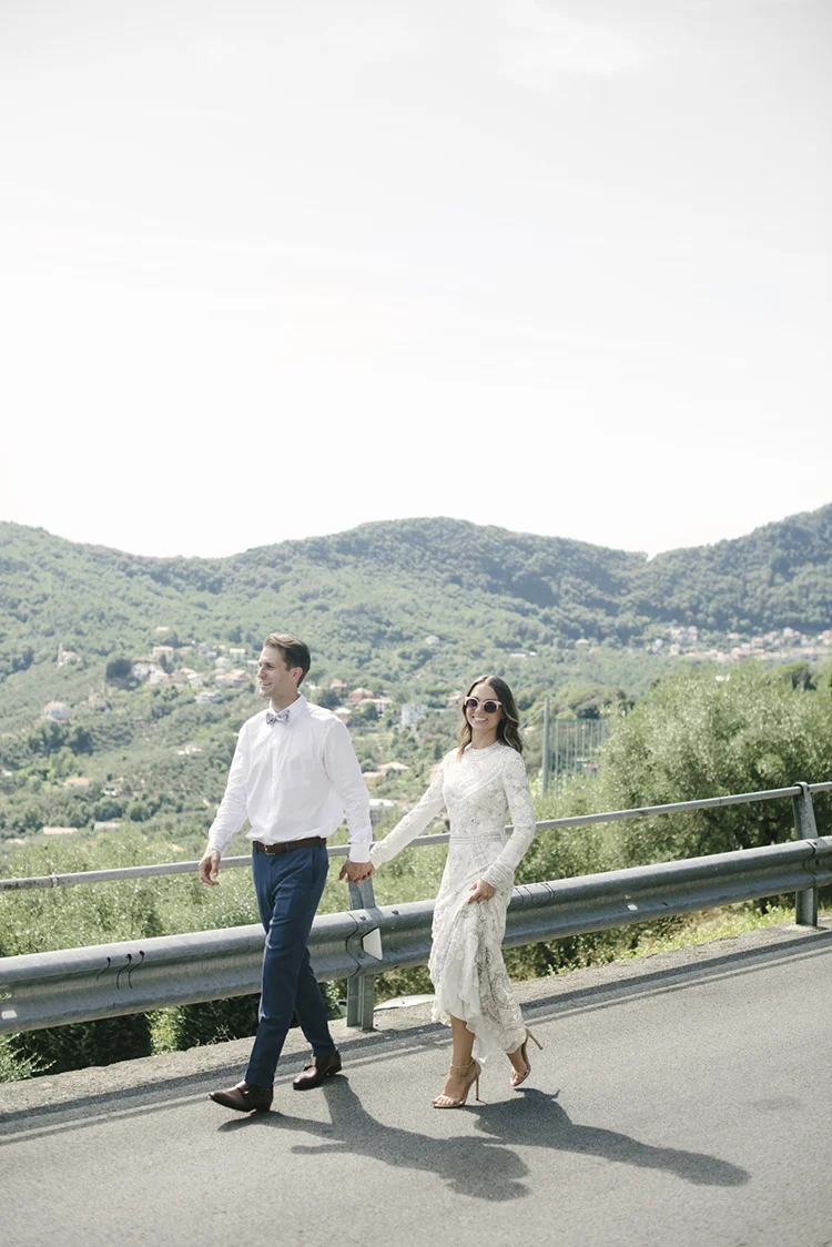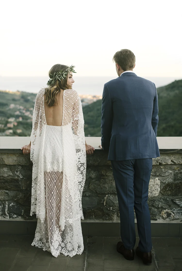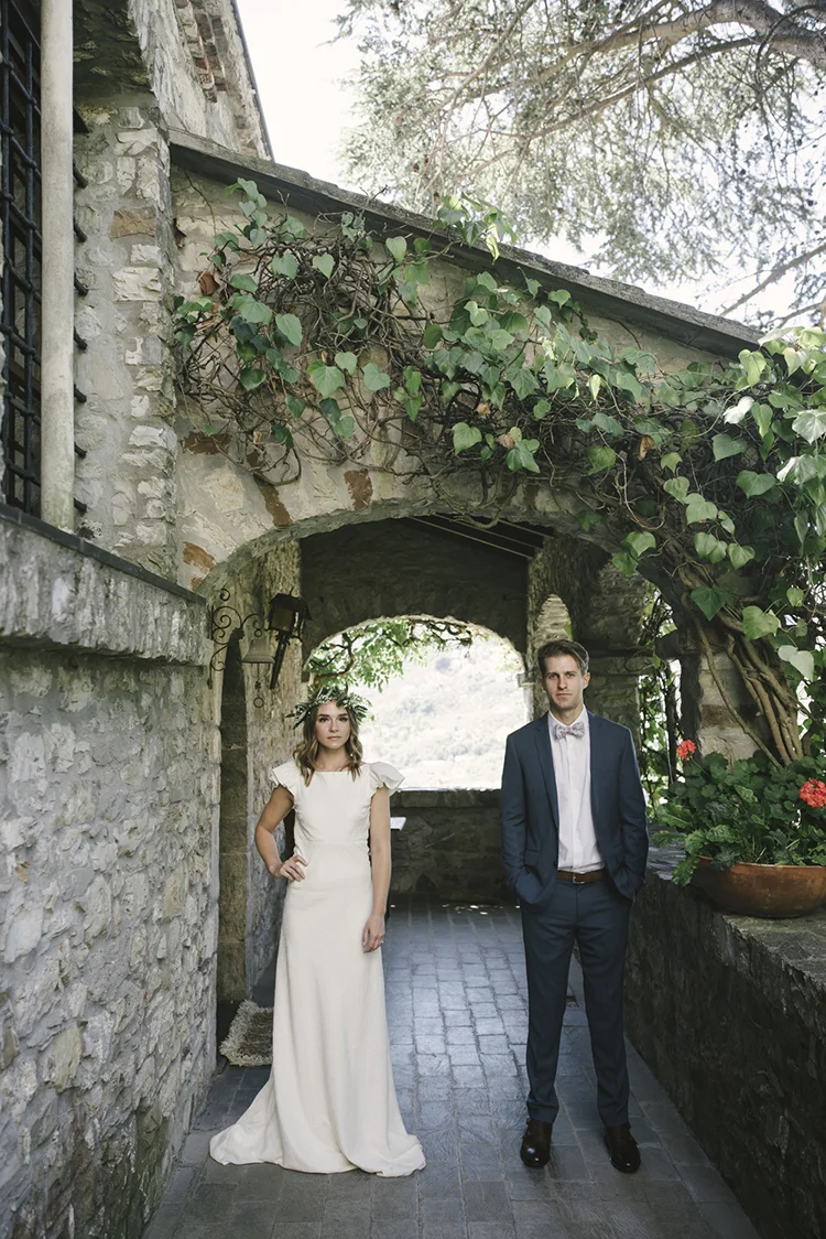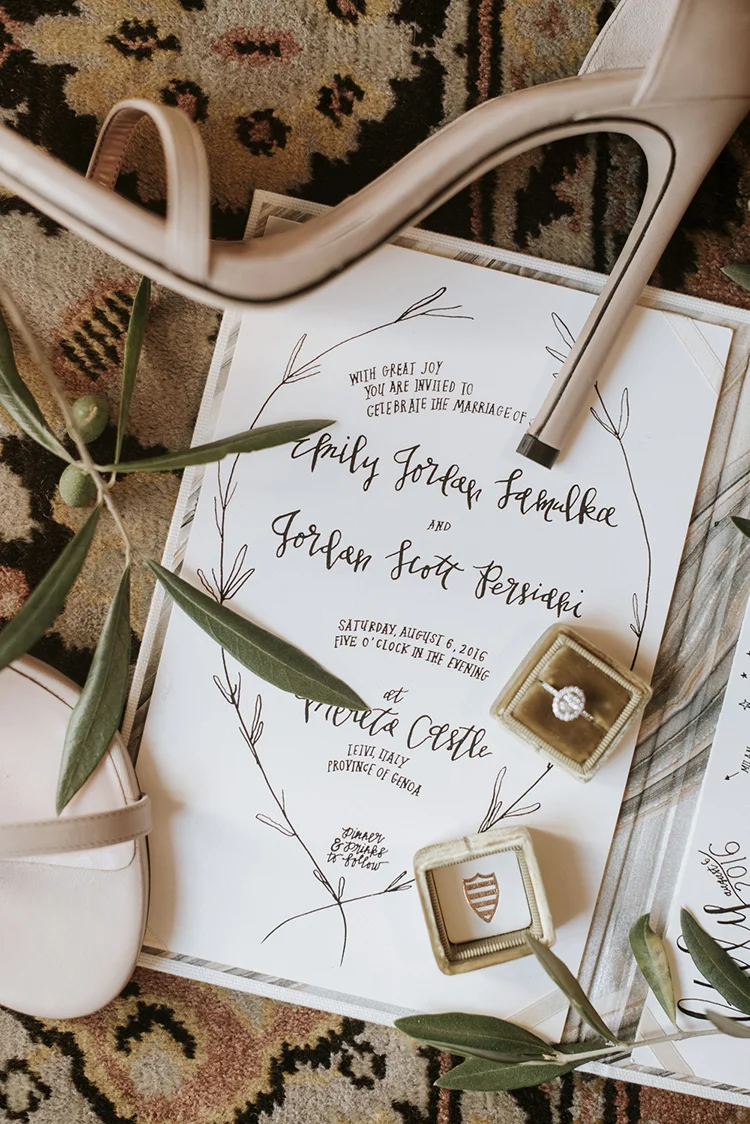Photographer: Ellie Koleen / Venue: Residential Castle in Leivi, Italy / Coordination & Styling: Calvy Click, Emily (bride), Jaymie Eaton, Kathleen Sharkey, Bride’s friend Angelica / Flowers: Local Florist, I Fiori di Rosy / Stylist: Calvy Click / Invitations: Jaymie Eaton / Cake & Catering: Pasticceria Copello / Bride’s Dresses: Reformation (customized), Delphine Manivet, Grace Loves Lace, Needle & Thread / Shoes: Stuart Weitzman Nudist Heels / Halo & Crown: DIY by Family / Jewelry: five-and-two / Ring Box: The Mrs. Box / Vow Book: Wedding Story Writer Clogs: BRYR / Groom’s Suit: J. Crew / Shoes: Too Boot New York / Wedding Band: Custom / Tie: Penguin