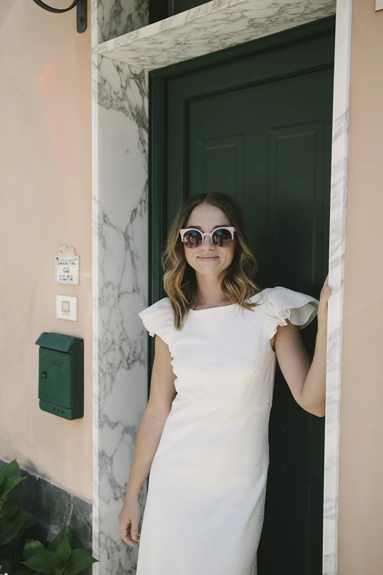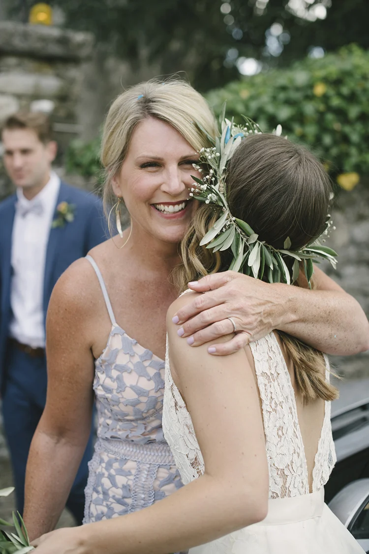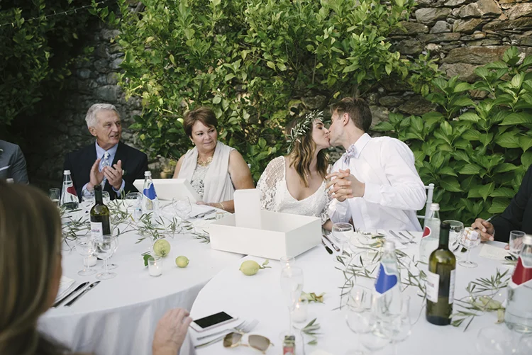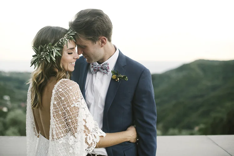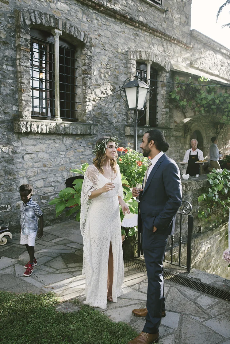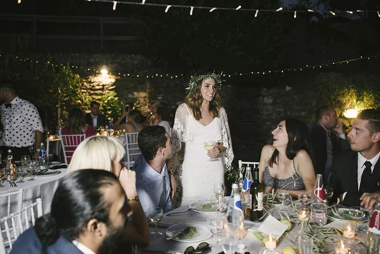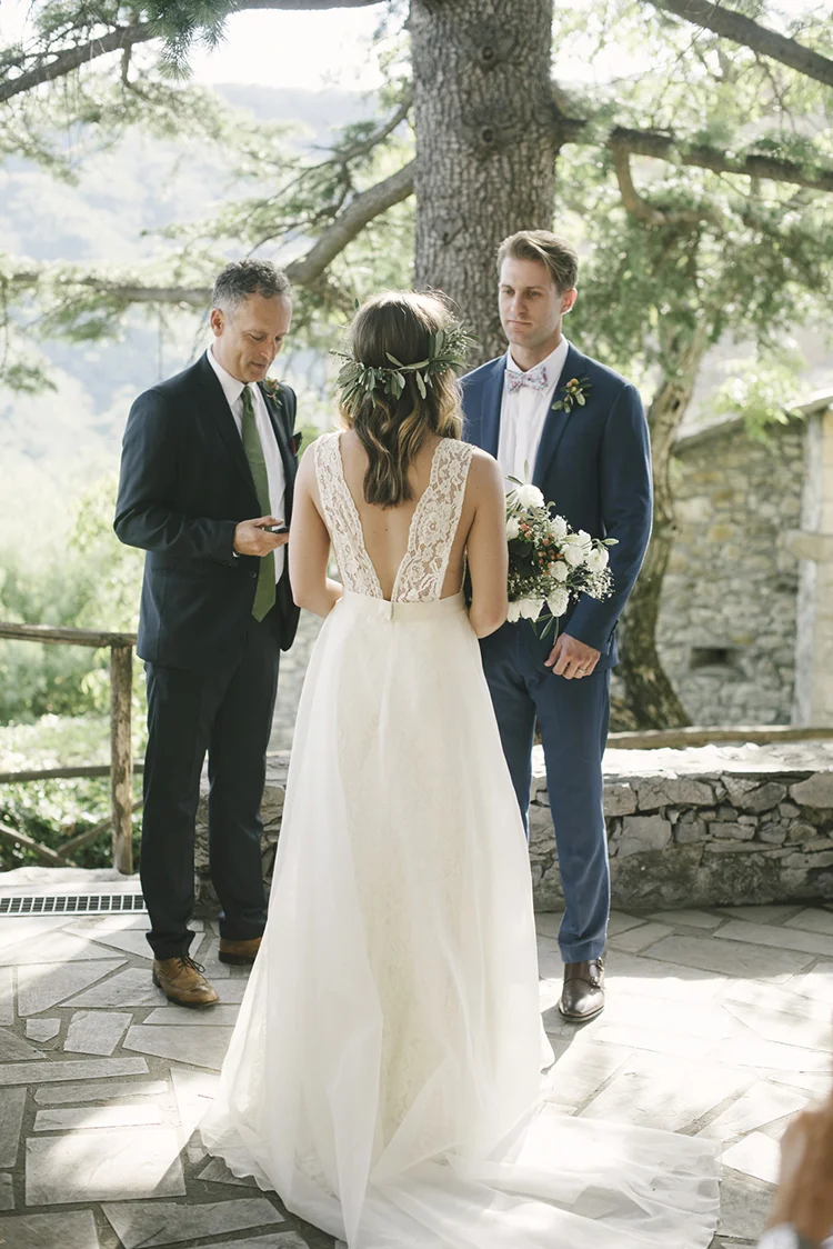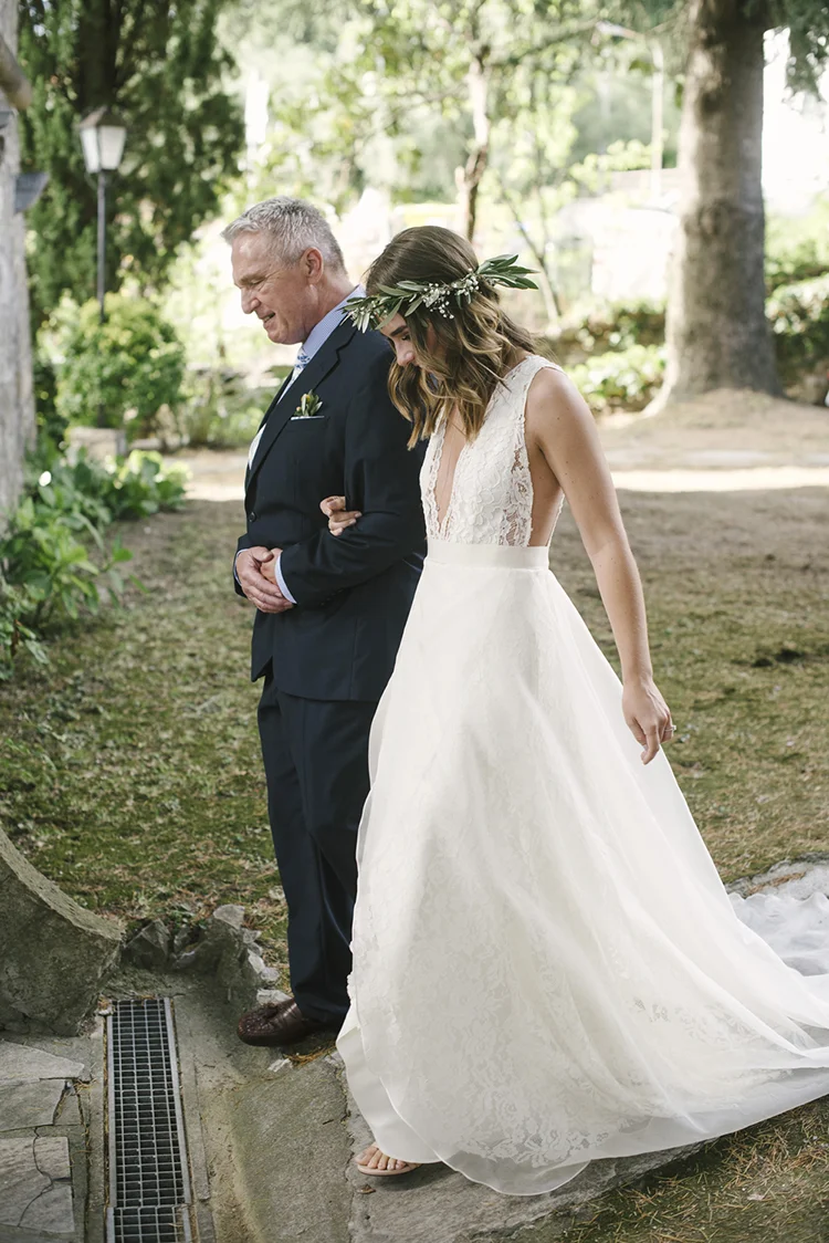Photographer: Ellie Koleen / Venue: Residential Castle in Leivi, Italy / Coordination & Styling: Calvy Click, Emily (bride), Jaymie Eaton, Kathleen Sharkey, Bride’s friend Angelica / Flowers: Local Florist, I Fiori di Rosy / Stylist: Calvy Click / Invitations: Jaymie Eaton / Cake & Catering: Pasticceria Copello / Bride’s Dresses: Reformation (customized), Delphine Manivet, Grace Loves Lace, Needle & Thread / Shoes: Stuart Weitzman Nudist Heels / Halo & Crown: DIY by Family / Jewelry: five-and-two / Ring Box: The Mrs. Box / Vow Book: Wedding Story Writer Clogs: BRYR / Groom’s Suit: J. Crew / Shoes: Too Boot New York / Wedding Band: Custom / Tie: Penguin