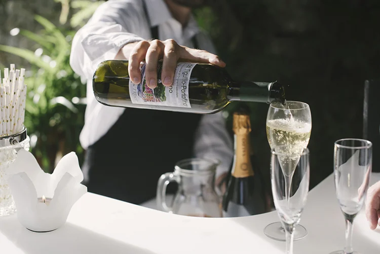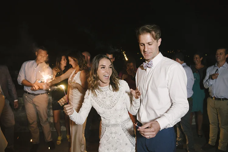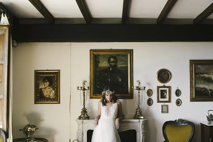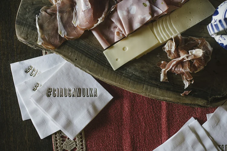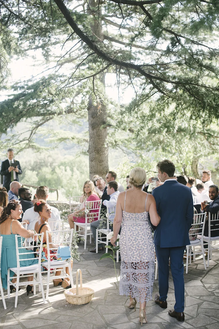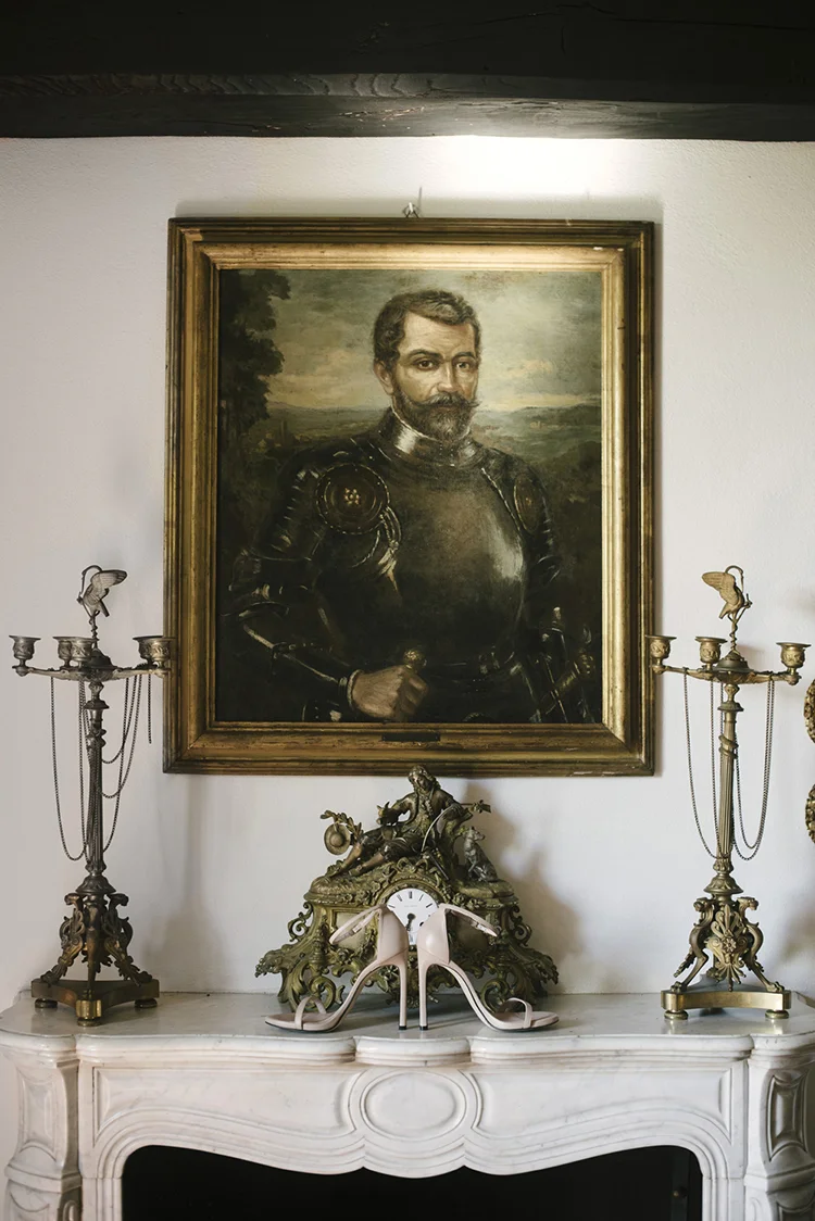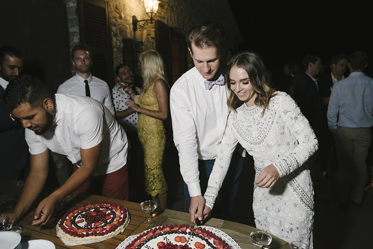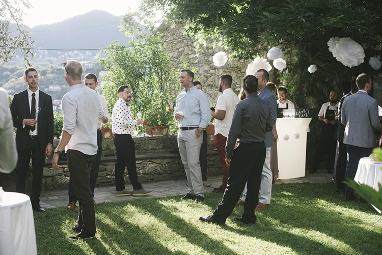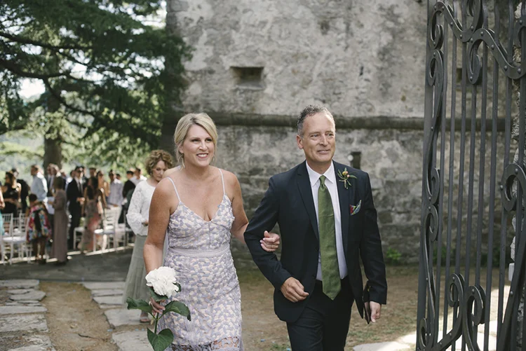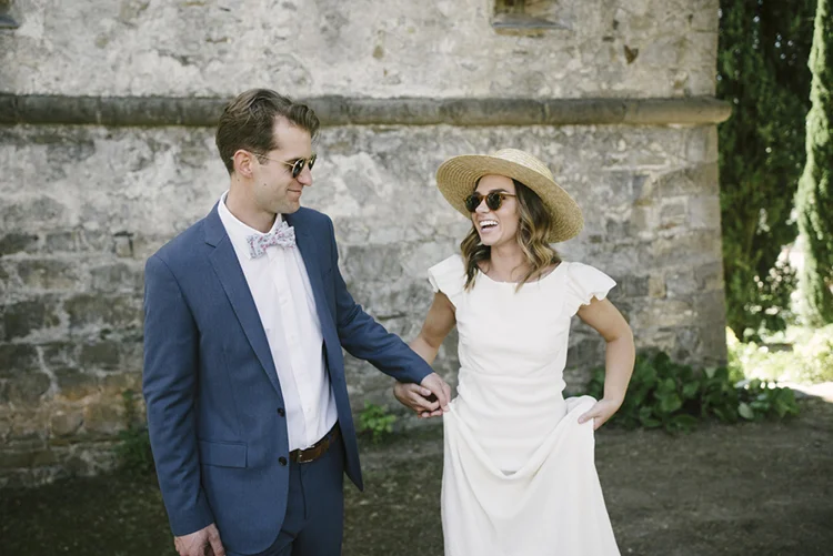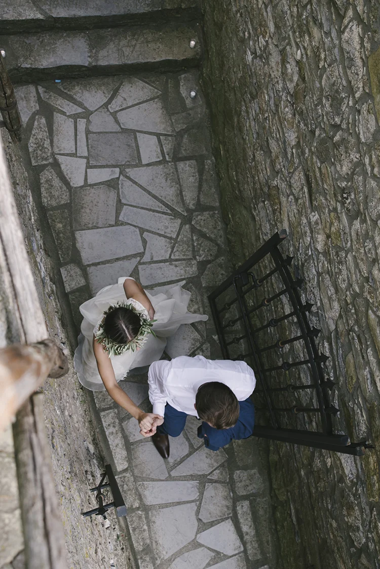 Photographer: Ellie Koleen / Venue: Residential Castle in Leivi, Italy / Coordination & Styling: Calvy Click, Emily (bride), Jaymie Eaton, Kathleen Sharkey, Bride’s friend Angelica / Flowers: Local Florist, I Fiori di Rosy / Stylist: Calvy Click / Invitations: Jaymie Eaton / Cake & Catering: Pasticceria Copello / Bride’s Dresses: Reformation (customized), Delphine Manivet, Grace Loves Lace, Needle & Thread / Shoes: Stuart Weitzman Nudist Heels / Halo & Crown: DIY by Family / Jewelry: five-and-two / Ring Box: The Mrs. Box / Vow Book: Wedding Story Writer Clogs: BRYR / Groom’s Suit: J. Crew / Shoes: Too Boot New York / Wedding Band: Custom / Tie: Penguin
